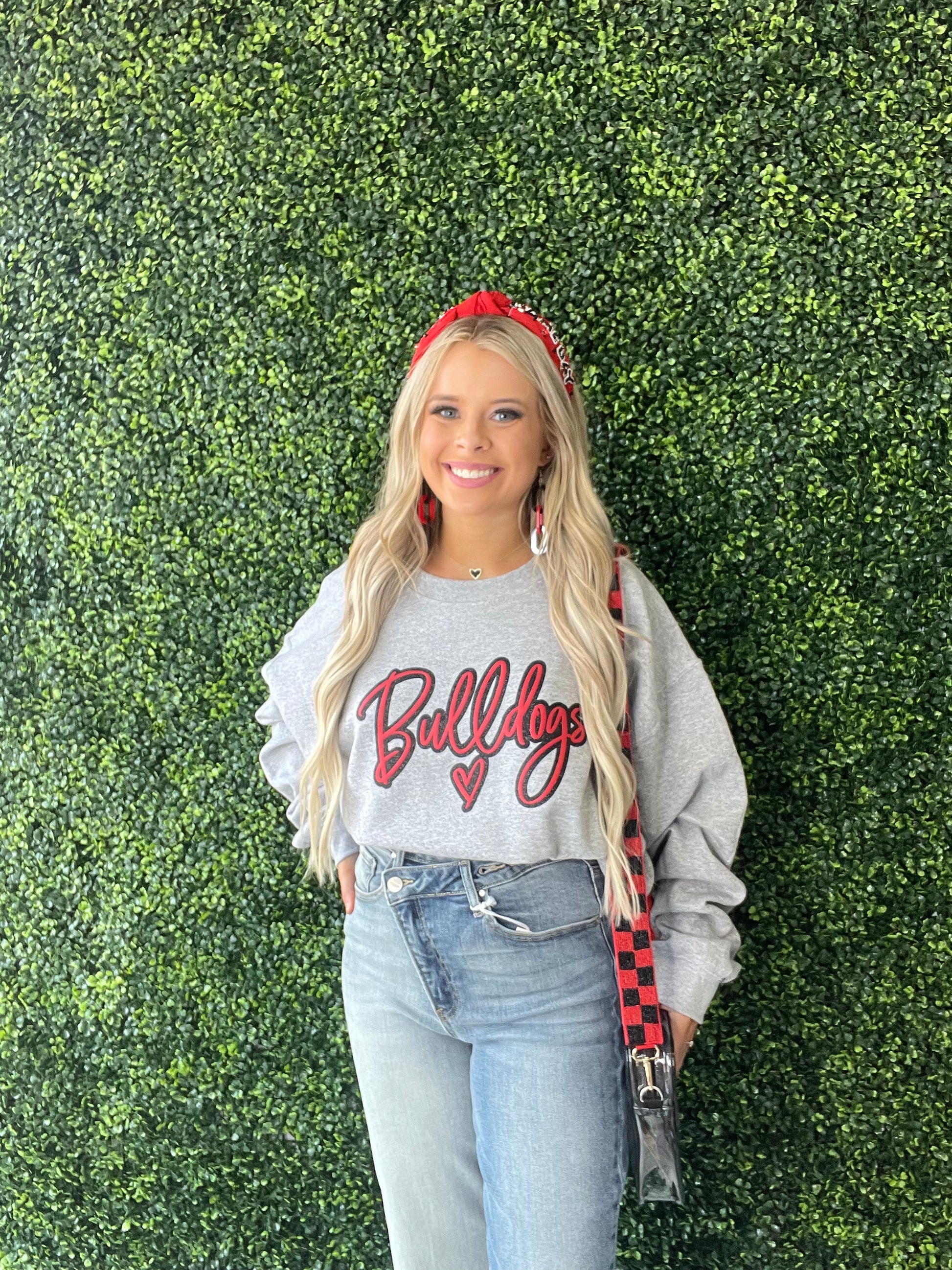 Show off school spirit and style while wearing Bulldogs Glitter & Puff Game Day sweatshirt. Stylishly crafted with glitter and puff accents, this sweatshirt radiates pride and energy - perfect for cheering on the team in comfort and style. Wear it with pride and get ready to roar!