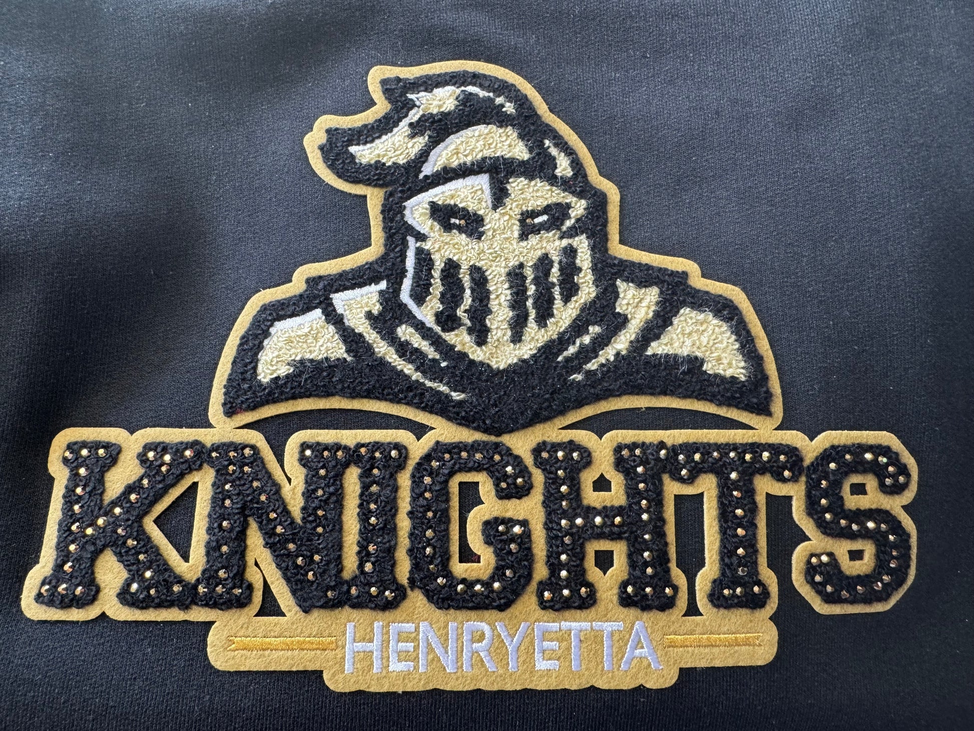 Youth & Plus Sizes are available in the store.This Knights Chenille Rhinestone Patch crewneck sweatshirt features a classic black color with stunning gold rhinestones that add a touch of elegance. The Knights logo and Chenille patch make it perfect for game day ready style. Stay comfortable and stylish in this must-have piece.